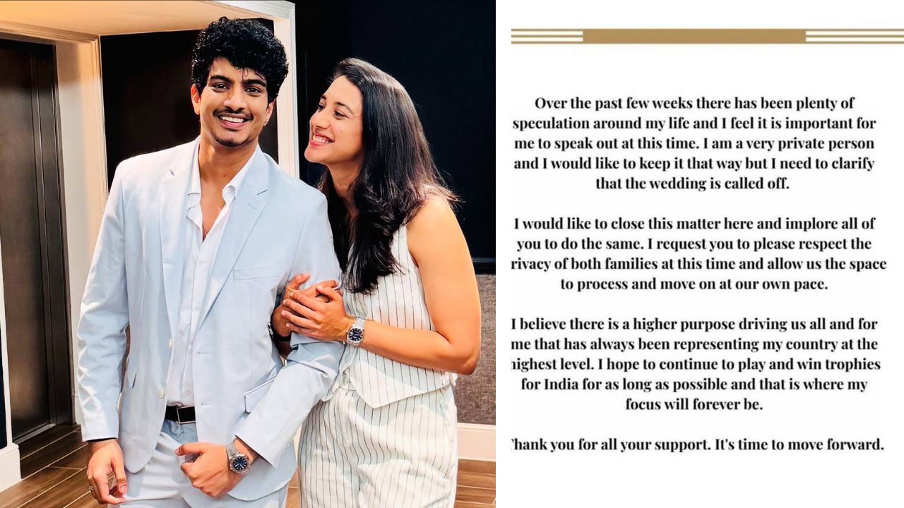 महिला क्रिकेट टीम की उप-कप्तान स्मृति मंधाना ने रविवार को घोषणा की कि उनकी शादी टूट गई है और उन्होंने प्रशंसकों और मीडिया से अटकलों पर विराम लगाने का आग्रह किया।