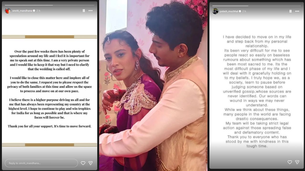 Smriti Mandhana and Palash Muchhal Wedding Cancel: कई हफ्तों से सोशल मीडिया पर तरह–तरह की खबरें उड़ रही थीं, क्या स्मृति मंधाना और पलाश मुच्छल की शादी सच में टूट गई? क्या सिर्फ शादी टली है या इसके पीछे कोई और वजह है? आखिरकार 7 दिसंबर को भारतीय स्टार बैटर स्मृति मंधाना ने इंस्टाग्राम पर आधिकारिक बयान जारी करके साफ कर दिया कि शादी अब पूरी तरह रद्द हो चुकी है।