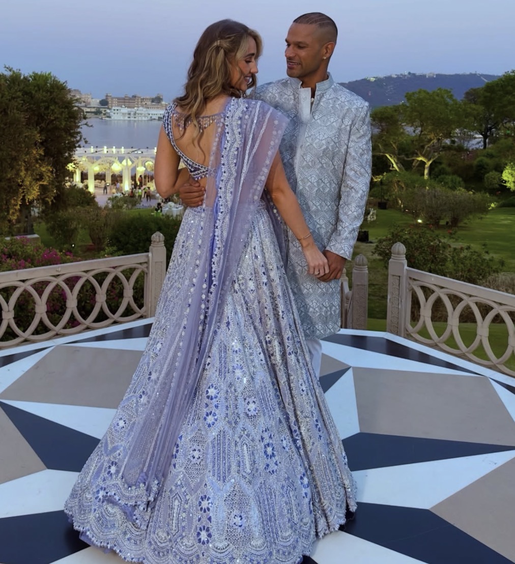 संगीत समारोह में शिखर ऑफ-व्हाइट इंडियन आउटफिट में नजर आए, जबकि सोफी गोल्डन शिमरी लहंगे में बेहद खूबसूरत दिखीं।