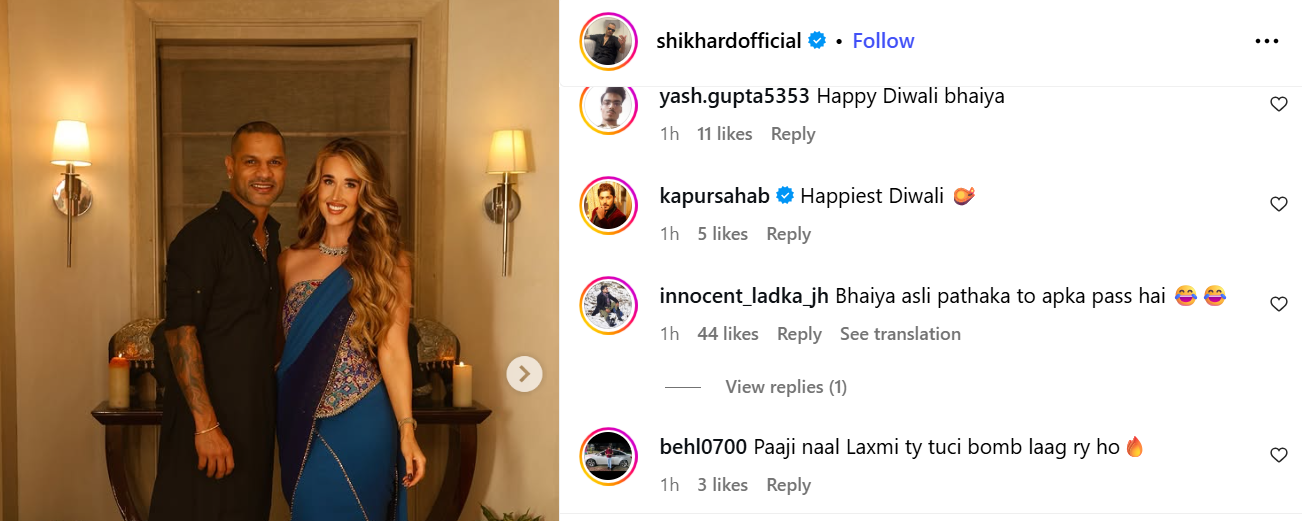 धवन ने फैंस को दिवाली विश करते हुए सोशल मीडिया पर सोफी के साथ तस्वीरें शेयर कीं। तस्वीरों को कैप्शन देते हुए धवन ने लिखा, "प्यार और रोशनी से भरी दिलावी सबके जीवन में खुशियां लाए!"